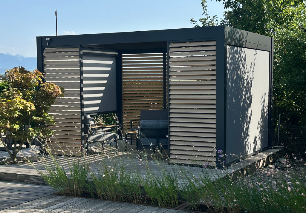 Lamellenwände machen eine Pergola wetterfest, vielseitiger und wohnlicher, während sie zugleich für mehr Privatsphäre und ein hochwertiges Erscheinungsbild sorgen.